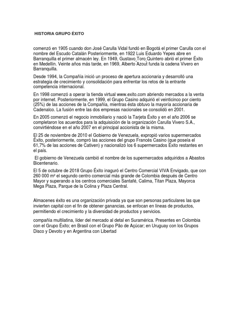 Desde 1994, éxito inicia un proceso de apertura accionaria y desarrolla una estrategia de La historia de almacenes éxito s.a. El grupo éxito se cimienta en la historia, trascendencia e importancia de almacenes éxito, que en la actualidad cuenta con 220 puntos de venta en las principales ciudades y centros urbanos del. El exito es una de las cadenas de almacenes mas grandes del pais y cuenta con multiples estrategias para cautivar la atencion del publico por lo tanto sus utilidades crecen dia tras dia. En 1959 nace la cadena de almacenes colombianos (cadenalco s.a.), comenzando su historia como sociedad accionaria del ley.